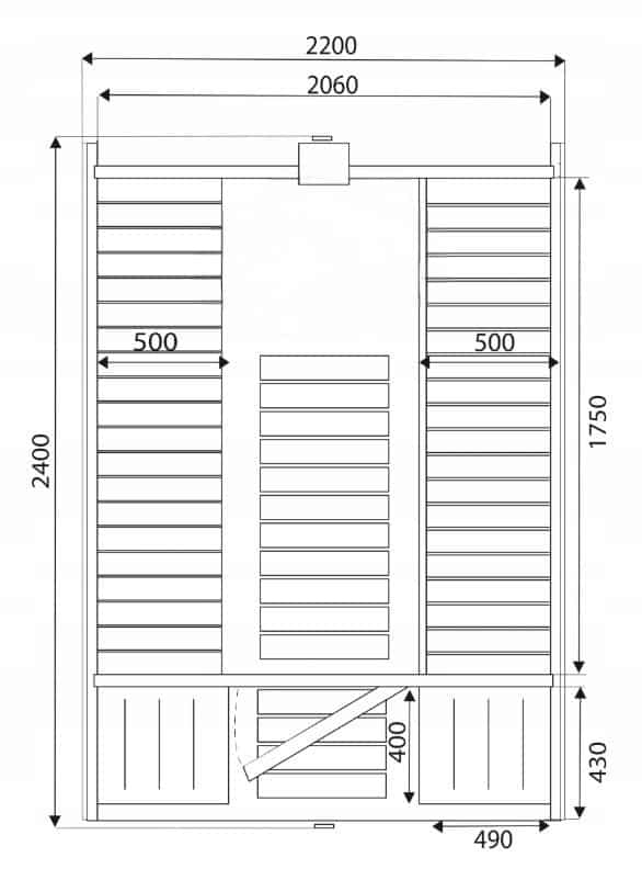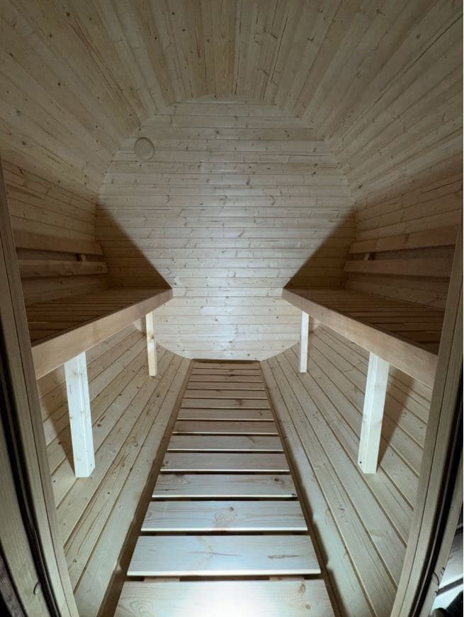 Techniniai duomenys: pirties išorinis skersmuo – 2,20 m, bendras ilgis – 2,40 m, vidaus pirties ilgis – ~1,75 m. Suoliai pagaminti iš alksnio medienos (25 × 88 mm), durys – grūdintas stiklas (8 mm, 700 × 1780 mm, rudos spalvos).