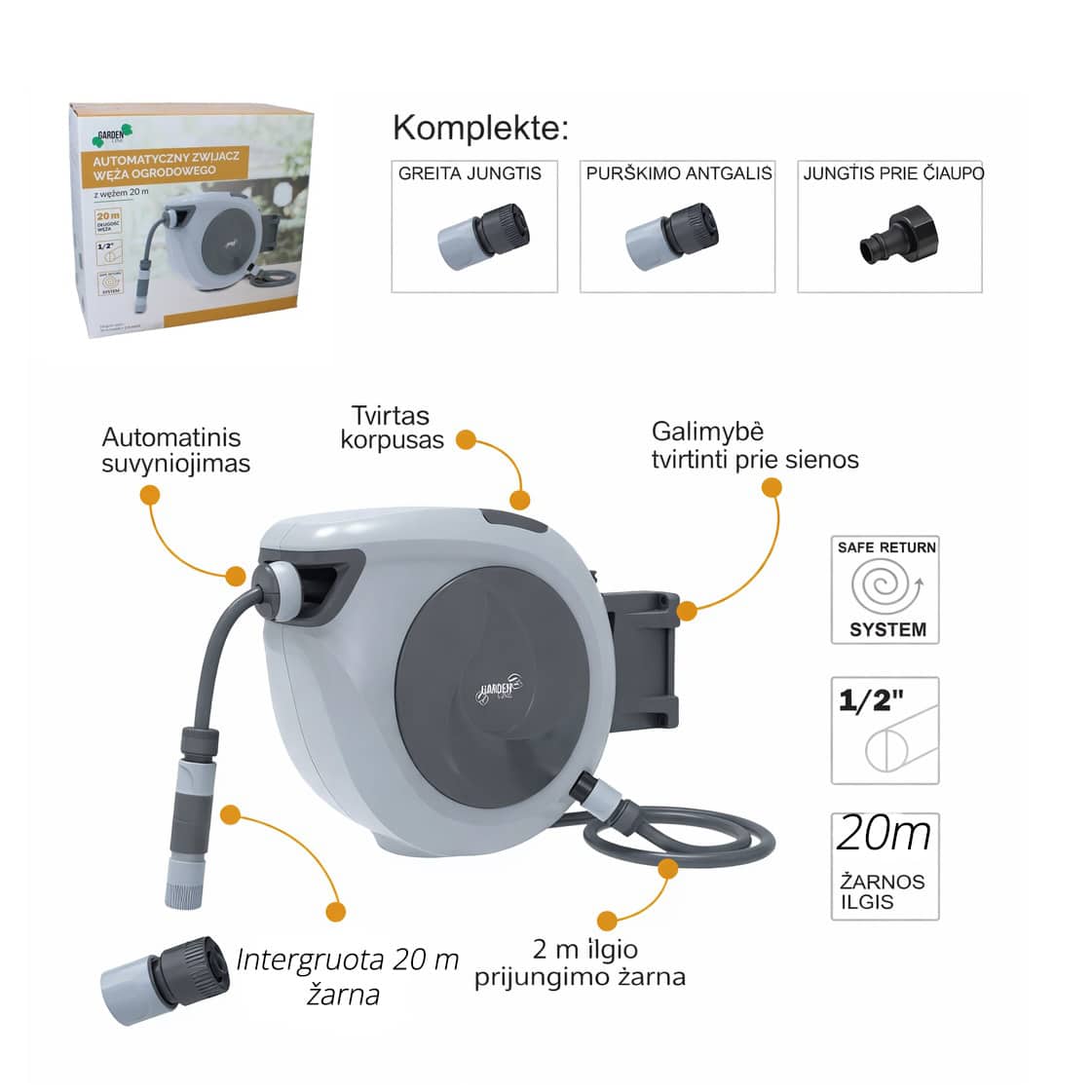 Norite tvarkingo sodo laistymo be painiavos? Šis automatinė ritė su 20 m žarna – puikus sprendimas vidutiniams sodams, terasoms ar kiemams. Traukite žarną iki reikiamos ilgio, sustojus ji fiksuojasi, o lengvai trūktelėjus dar kartą, žarna automatiškai susukama be mazgų. 180° besisukantis laikiklis leidžia pasiekti kiekvieną kampelį. 🌿🏡