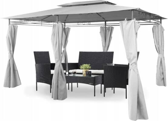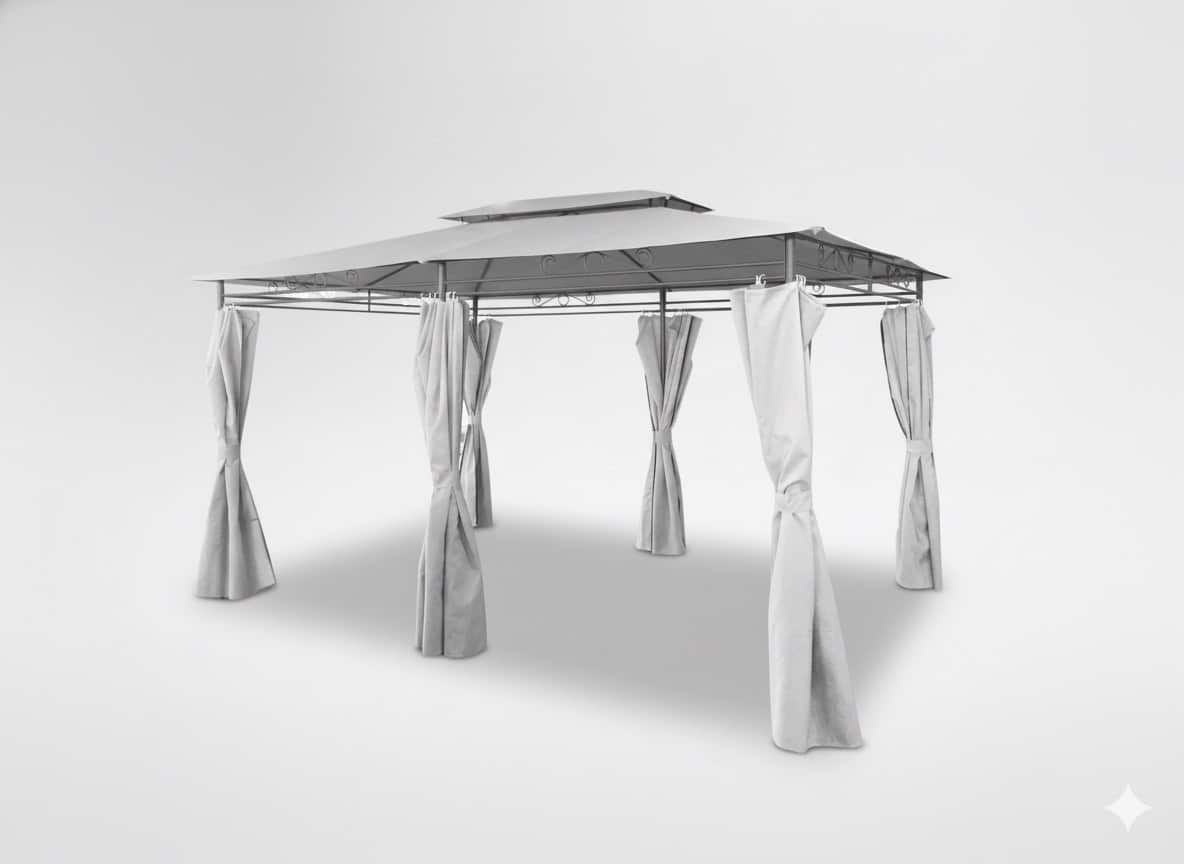 Erdvioji pavėsinė 3 × 4 m su šoniniais uždangalais – puikus sprendimas dideliems šeimos susibūrimams, piknikams ar terasos zonai. Apsaugo nuo saulės ir lengvo lietaus, užtikrina privatumą. **12 m²** erdvė!
