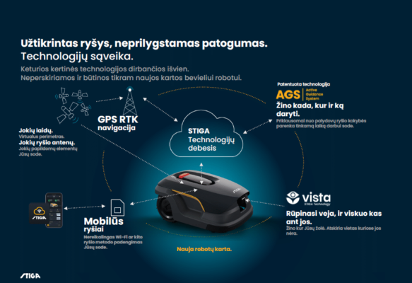 Išmanus robotas vejapjovė numatydamas savo kelyje kliūtį sustoja ir automatiškai pakeičia judėjimo kryptį, taip neleisdamas peiliukams nieko pažeisti. STIGA patentuotos AGS ir ,,Vista”technologijos veikia kartu, kad pagerintų roboto GPS RTK navigaciją.