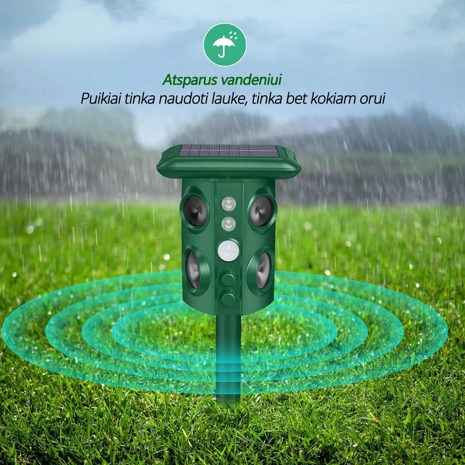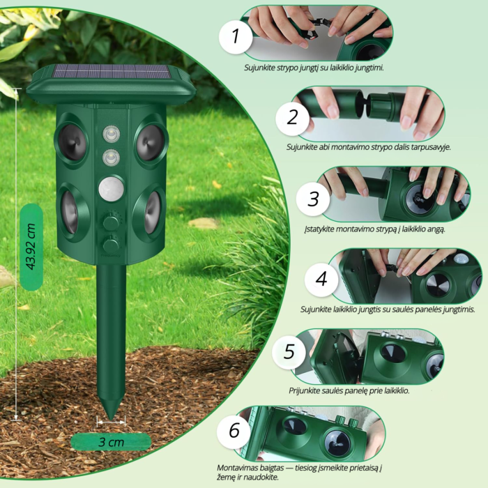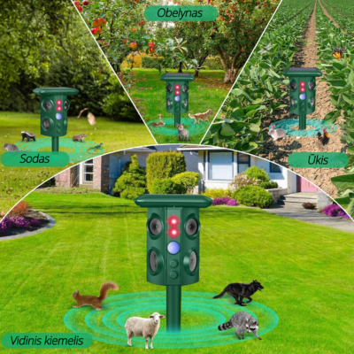 Vienas iš naujausių itin aukštos kokybės reguliuojamo dažnio ULTRAGARSINIS ir VIBRACINIS kenkėjų atbaidymo prietaisas su infraraudonųjų spindulių aktyvatoriumi, dviem kampais nukreiptomis net keturiomis ultragarsą skleidžiančiomis kolonėlėmis, papildomai įjungiama blykste ir raudonos spalvos plėšrūno akis imituojančia šviesa. Prietaisą patogiai galima įsmeigti į žemę (kuoliukas pridedamas prie rinkinio).