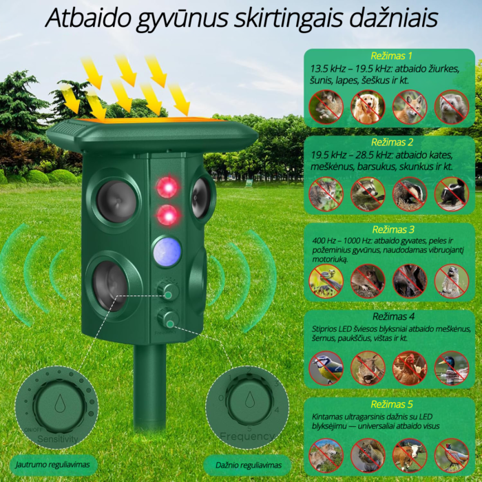 Reguliuojamas dažnių diapazonas leidžia efektyviai atbaidyti pasirinktą gyvūnų rūšį